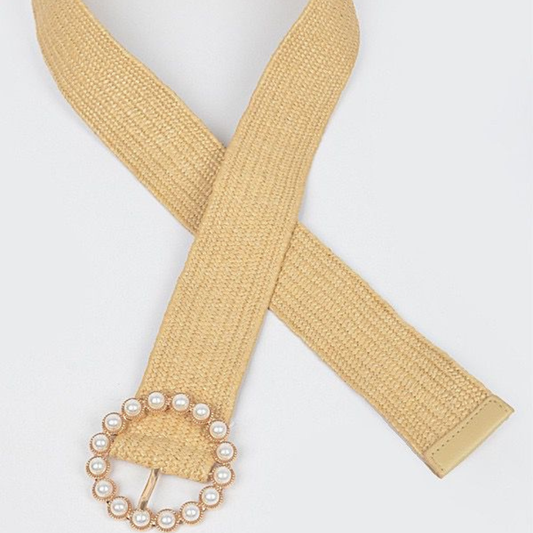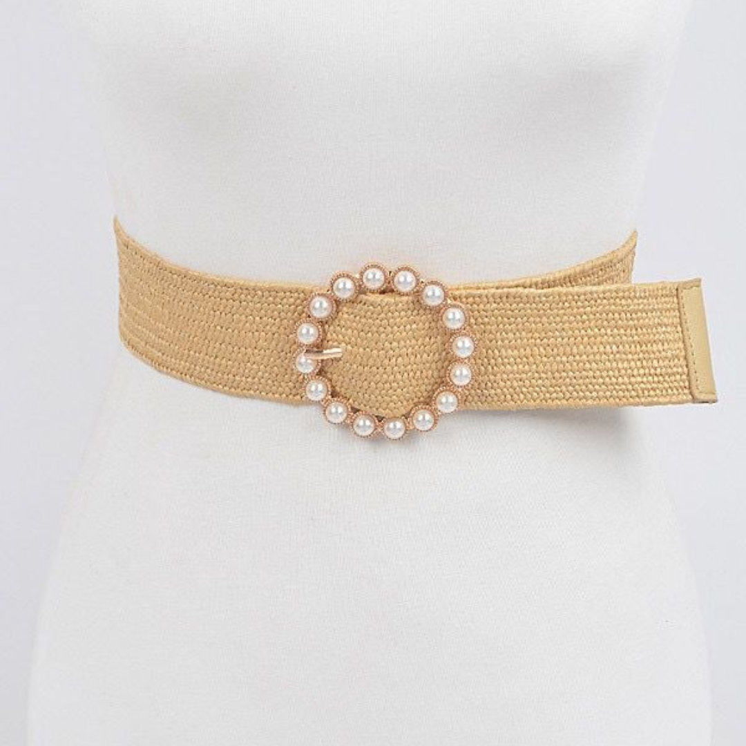 Hebilla ajustable rodeada de perlas brillantes.