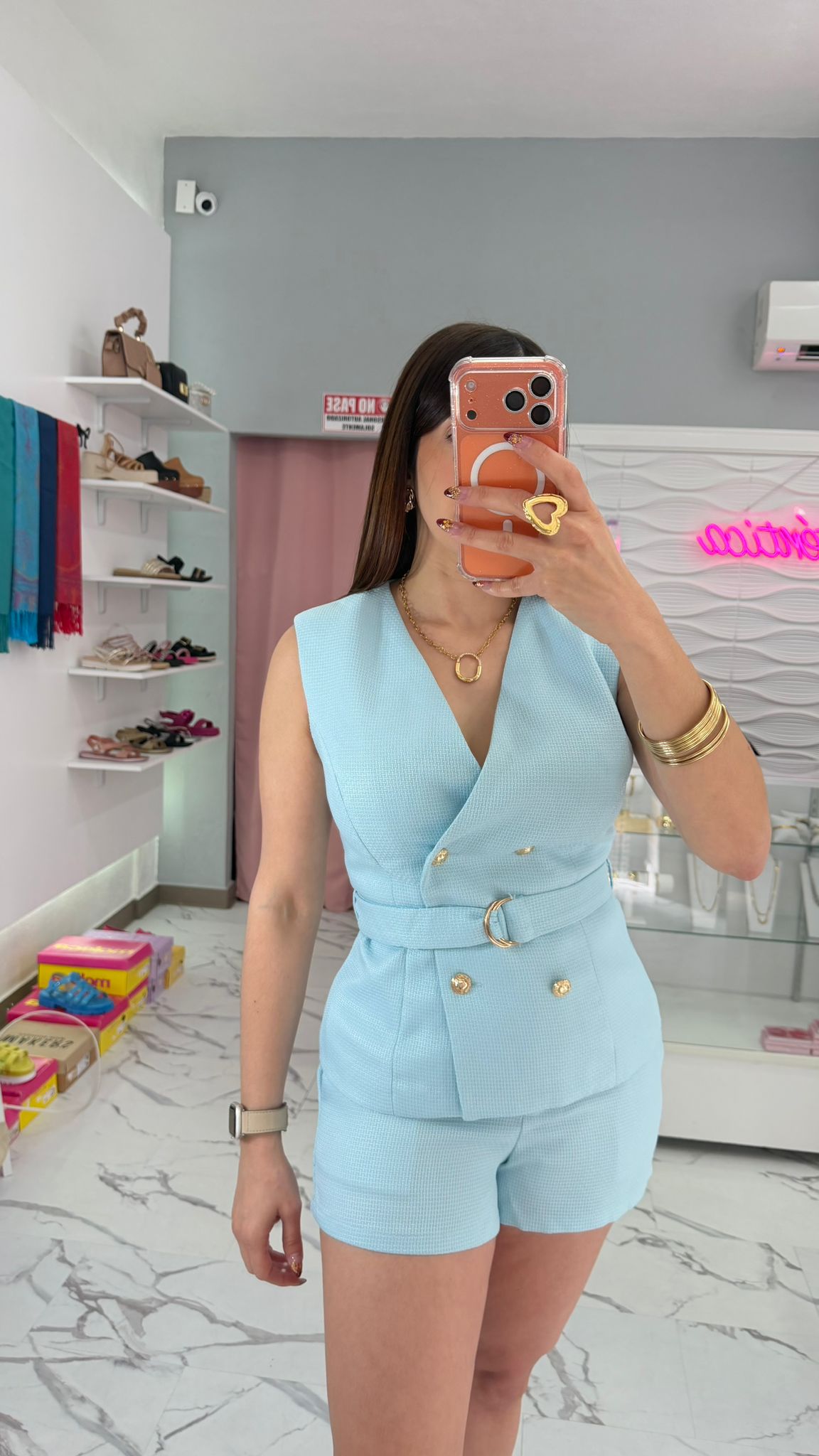 Short tiene elástico en la parte de atrás de la cintura, al frente tenemos botones y zipper. En la blusa los botones son funcionales, incluye el cinturón.